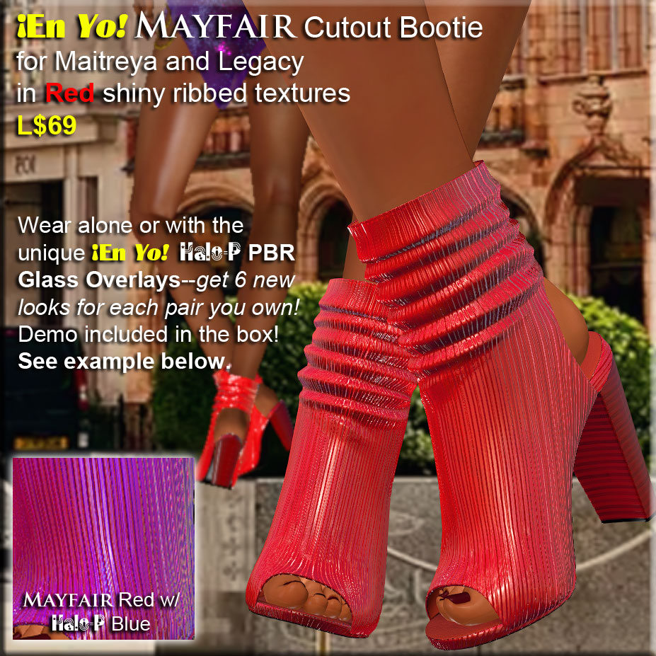 My first time making my unique Halo-P PBR Glass Overlays for anything other than Maitreya! Check out these hot open-toe boots with ruched top and tight vertical-rib texture. Mayfair comes in 9 colors for only L$69 each, or save with the Fatpack at just L$450. But then multiply the fun and possibilities with the Halo-P PBR Glass Overlays Fatpack at L$149 and get 6 new looks for every Mayfair color you own!