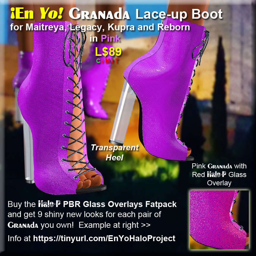 My first time making boots with my unique Halo-P PBR Glass Overlays available for Kupra and Reborn! These boots come in 9 colors with a sexy open front and a shiny transparent heel for L$89 each (all 4 body versions come in the box). But then buy the Halo-P Fatpack for just L$159 and get NINE shiny new looks for each pair of Granada you own! (Actually even more, because you can wear more than one glass Halo-P color at the same time.) If you live in one of these other bodies, here’s a great time to try my amazing HALO Project glass overlays!