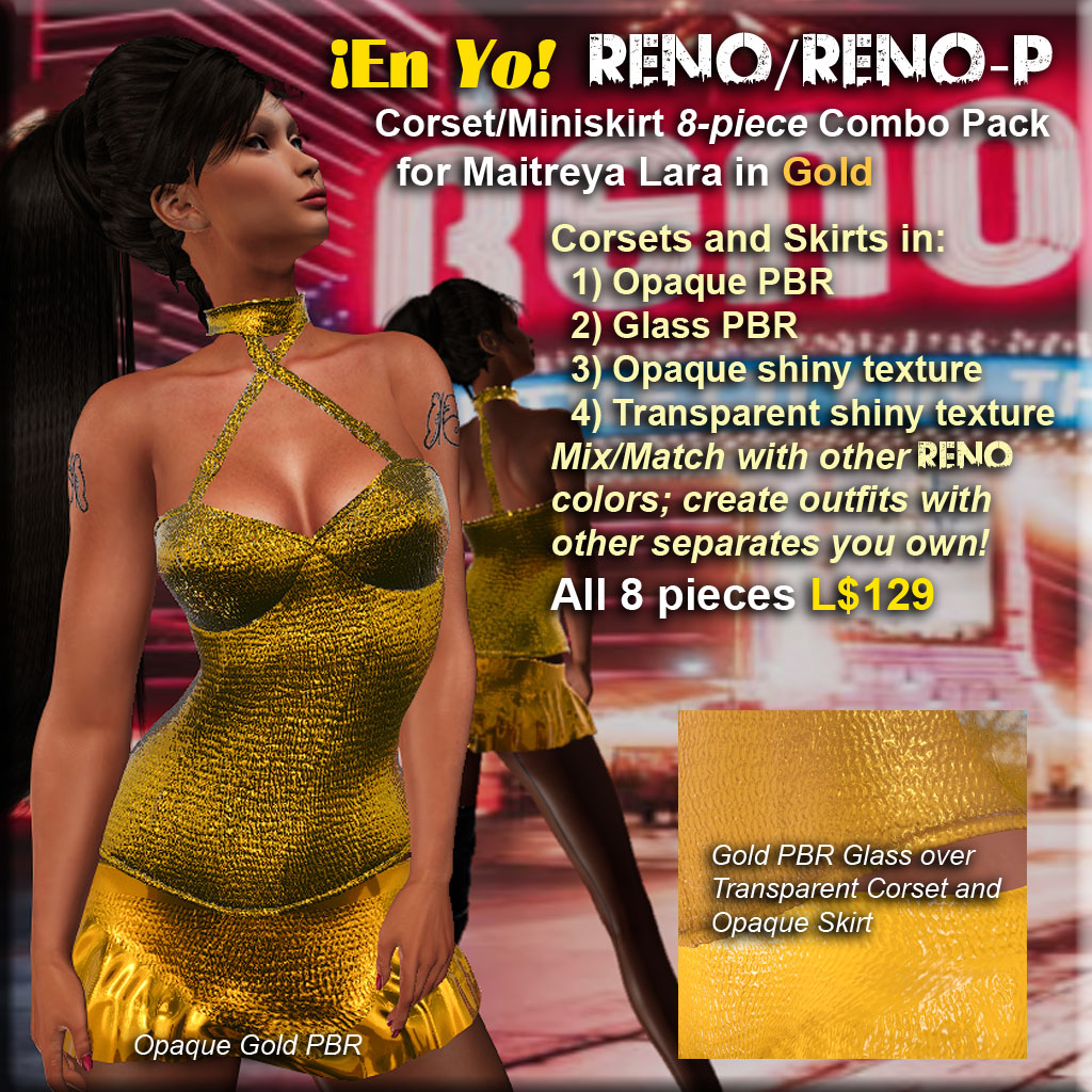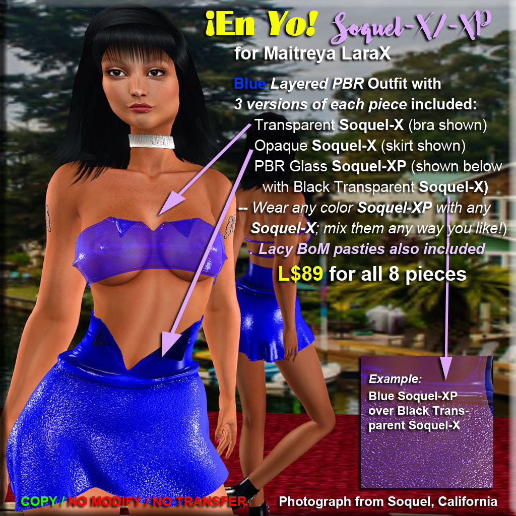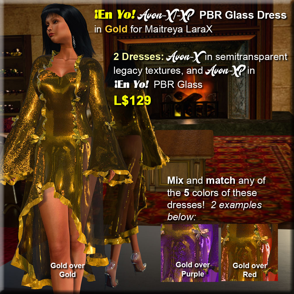With the Bistro-XP GLASS dress, ¡En Yo! broke ground with something entirely new! My new glass dresses combine PBR and legacy textures in a whole new way, and let you mix and match these transparent colors to create many different looks.