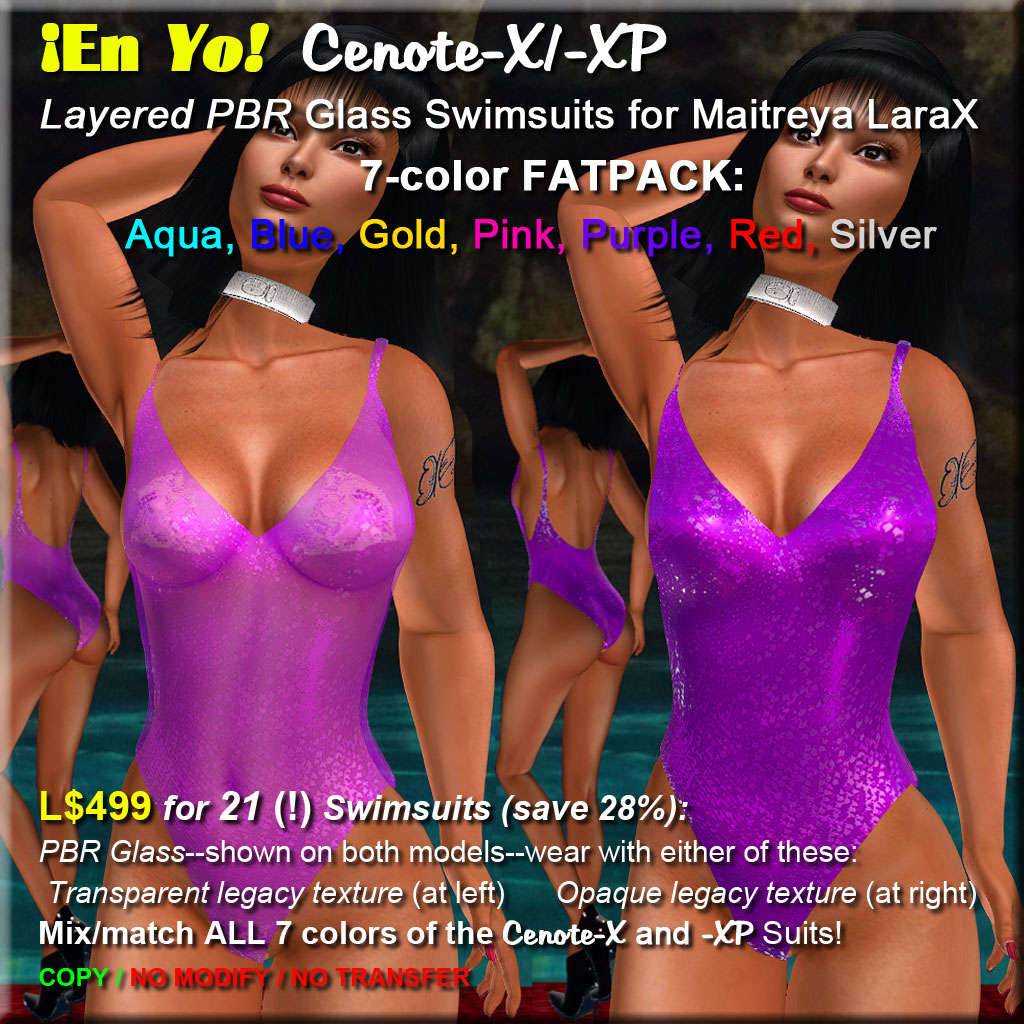 These clean-design swimsuits for LaraX are named for the beautiful underground water caves of the Yucatán Peninsula! There are 7 colors, and each box gives you 3 suits: Cenote-XP PBR Glass, and both transparent and opaque Cenote-X versions. Wear any color XP with any X, mixing and matching any way you like! L$99 for all 3 of any color; L$499 gets all 7 colors. (21 suits–I’m not going to try to figure out how many outfits that is!).