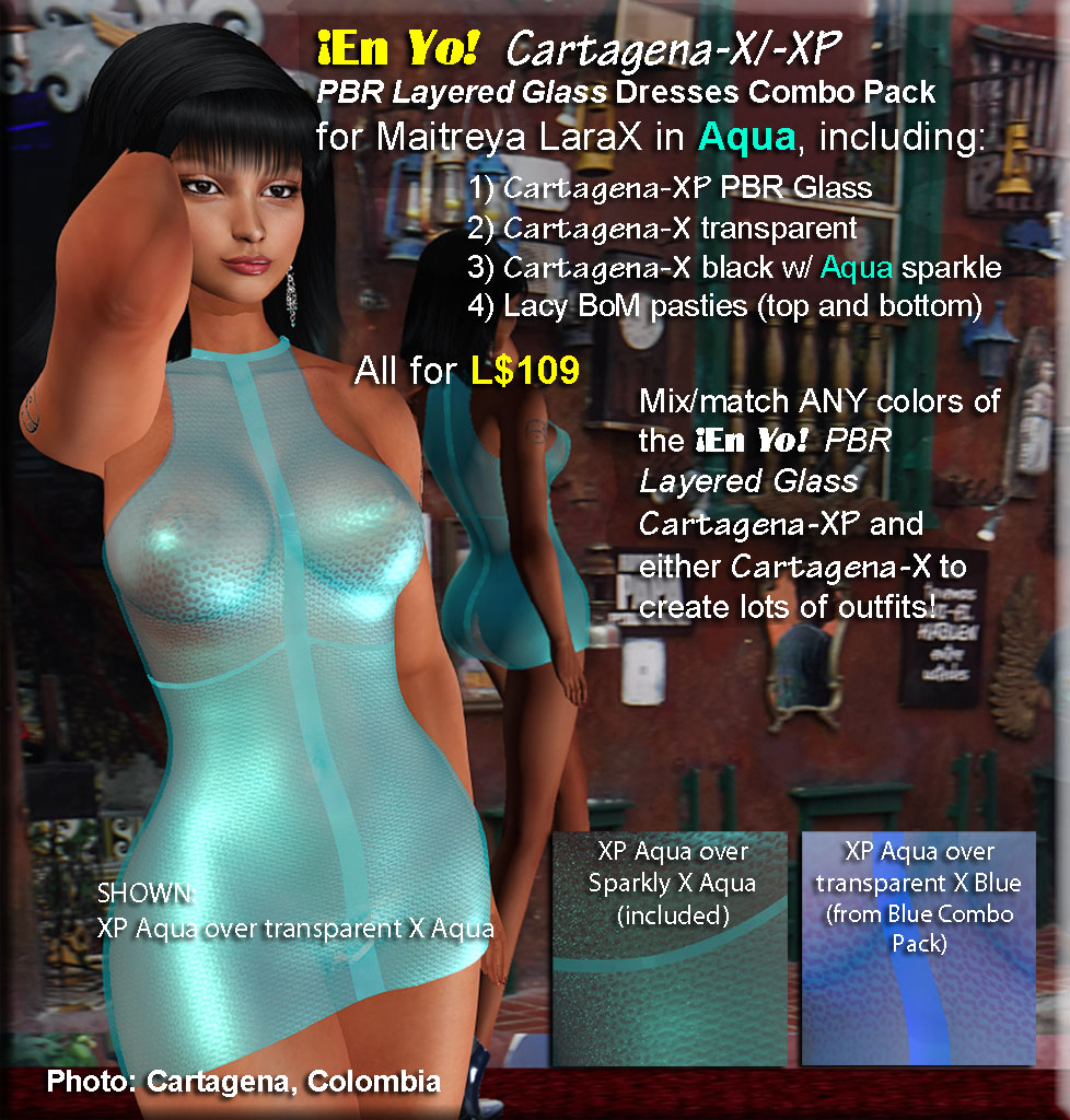 The first full-line Layerable Glass dress is ¡En Yo! Krystal-X/-XP in 7 colors for LaraX. I added some basic lace BoM underwear to the package because Krystal-XP doesn’t have the more opaque front panel of Bistro-XP. The Krystal package is L$129 for one, or L$499 for all 7. (Remember, you can mix and match these dresses to make many different combinations! And because it’s PBR, the appearance will change with the lighting–watch the demo video! Try Krystal-XP with my Jalisco-X dress too!)