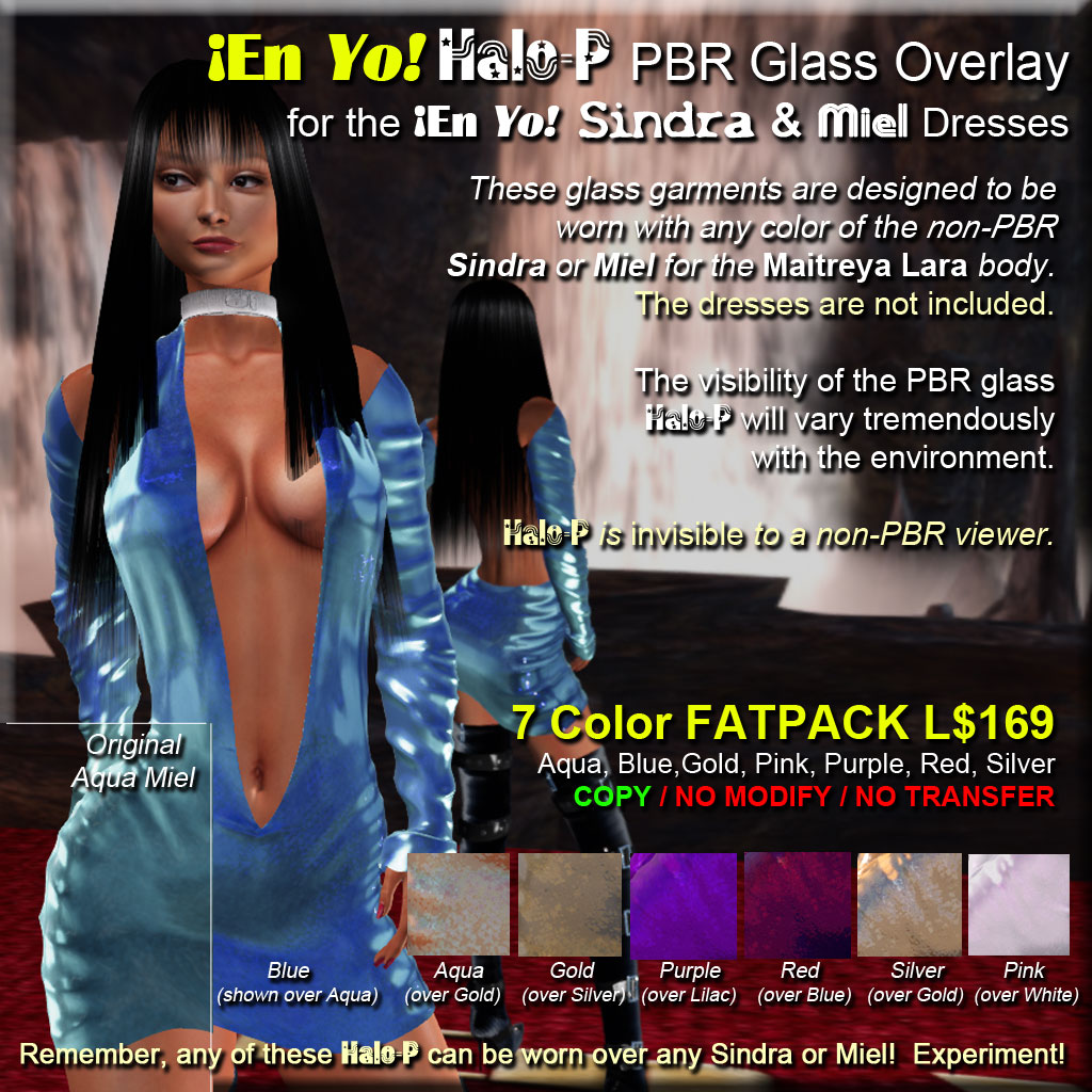 By the way, you can also try the Halo effect if you buy one of my PBR Glass dress combinations, and then wear the Glass dress over whatever original ¡En Yo! dress it was made from! I’ve indicated those on the Glass Clothing page. No guarantee this will always work, but certainly worth experimenting.
