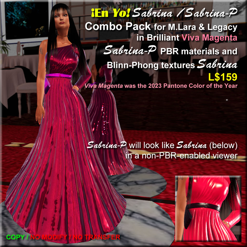 See the magic of pleats in a long gown! You know how long mesh dresses stretch out and look awful. But the pleated texture of Sabrina and Sabrina-P stretch much more naturally, like the way curtain pleats unfold as you close it. Be sure to view the video on Flickr of this gown in motion to see what I mean! Then buy the Sabrina/Sabrina-P Combo Pack on MP or in my shops (where half you L$ go directly to support the hosting sim). Now for Legacy too!