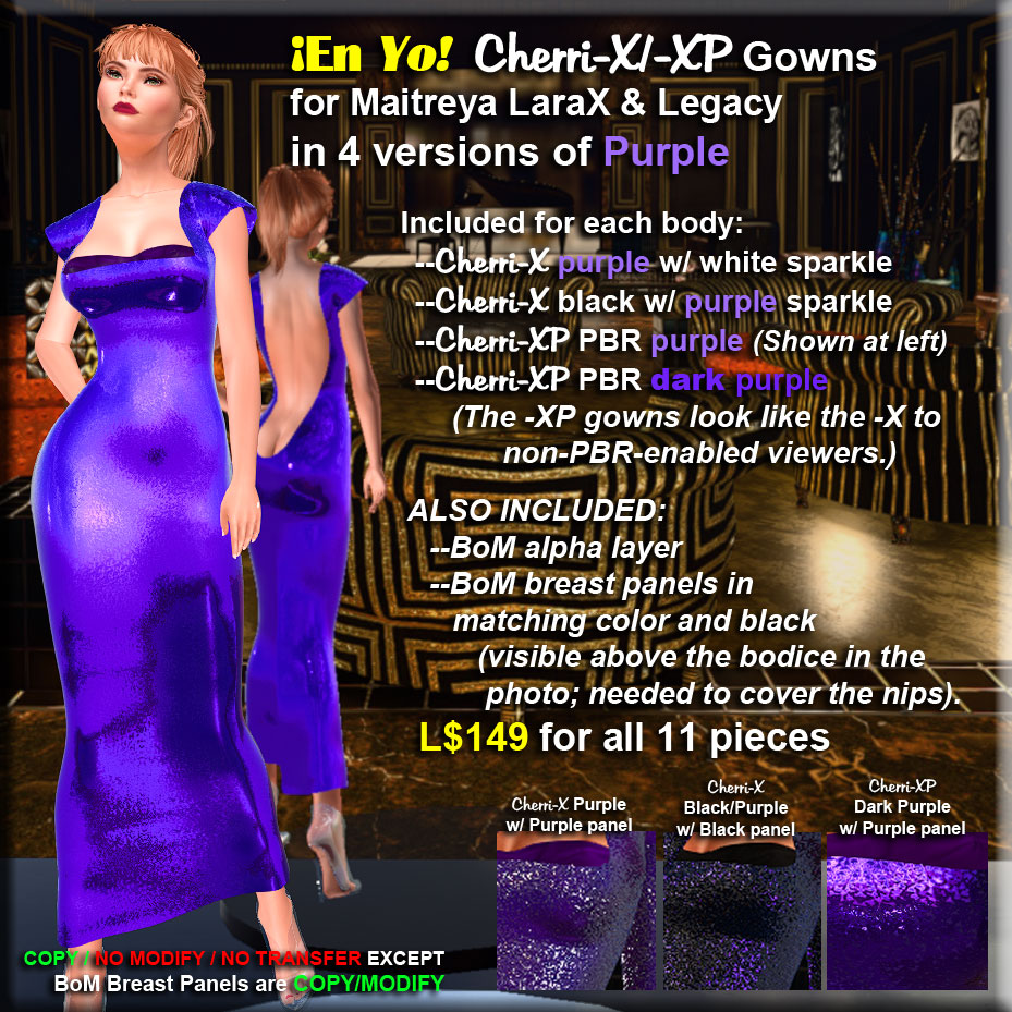 Beautiful Cherri-X/-XP gives you 4 versions (for each body). The photo shows you the lighter XP PBR version; you also get a darker XP, an intense sparkling non-PBR, and one in black with that color sparkle. All 8 gowns (and more) forL$149!
