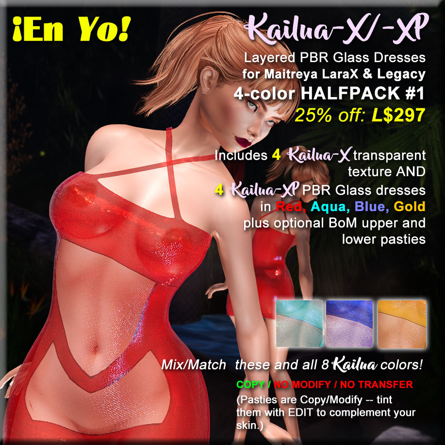 Here’s an¡En Yo! glass dress that lets a LOT of you show through! Kailua-X/-XP for LaraX & Legacy comes in 8 colors; buy individually (2 dresses in the box) for L$99, or save 25% with either of my two 4-color Halfpacks for L$297!