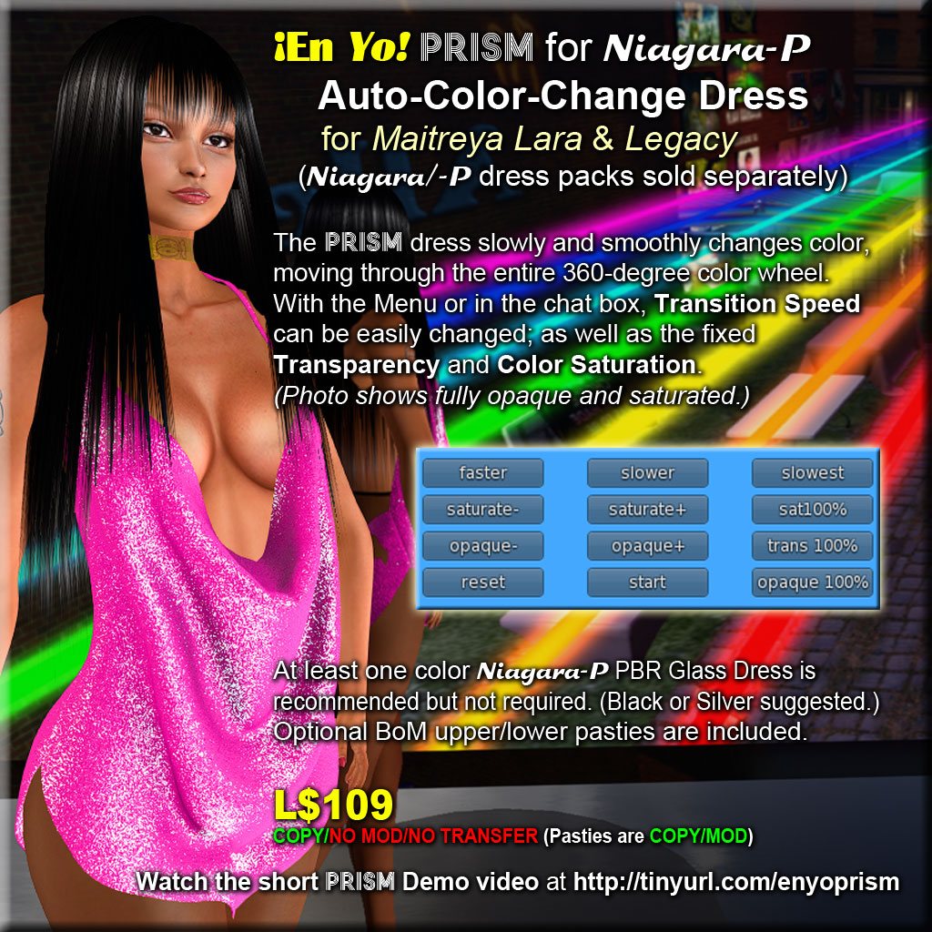 My¡En Yo! Meteora-XP Toga Dress is already amazing; the new PRISM-X makes it magical. The layers of these dresses cause the colors and transparency to flow around you like nothing else! L$129 for LaraX and Legacy, with modifiable BoM pasties.