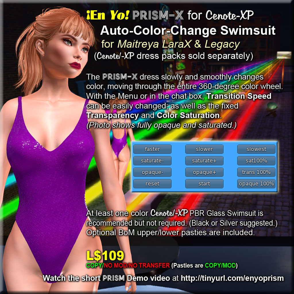 How’bout a swimsuit (or bodysuit if you prefer)? Here’s PRISM-X for CENOTE-XP! You’ll make a huge hit at your next beach party! L$109 for both LaraX and Legacy versions and the optional little BoM modifiable pasties.