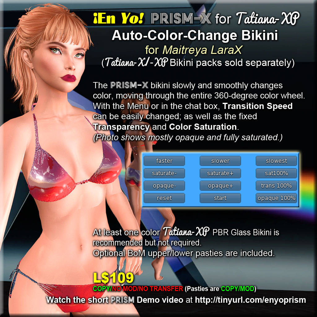 Need a bikini? Here’s PRISM-X for the TATIANA-XP bikini outfit! Note that the suit is ONE OBJECT even though it looks like it’s two pieces. L$109 for the bikini and modifiable BoM pasties.