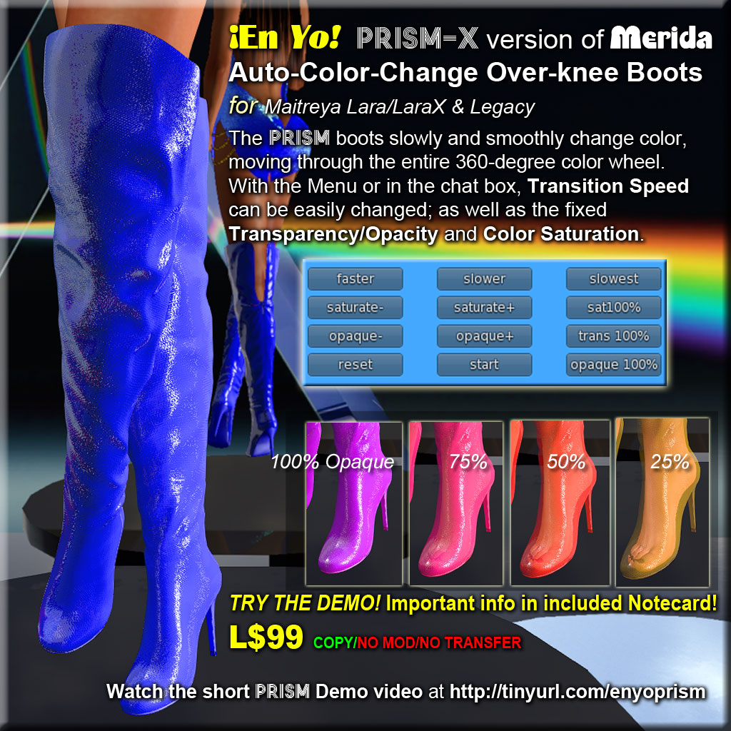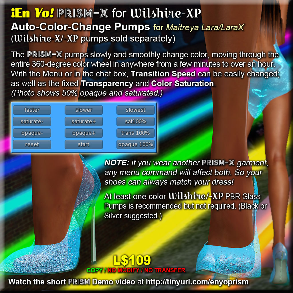 Here are my first shoes with the PRISM effect! My classic WILSHIRE-XP pumps get the PRISM treatment! Note that they run the same script, so they will stay synched with any other PRISM garment (just start with a RESET when you’re wearing both). Wear the PRISM-X alone or with your glass Wilshire-XP for different effects.