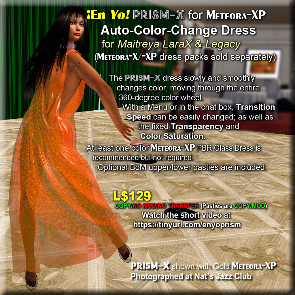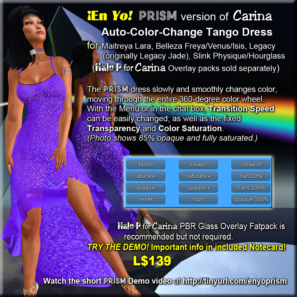 Here’s a very special color-change dance dress for SEVEN different mesh bodies! L$139 for a BIG BOX of dresses! If you have a Lara body, you can also wear this PRISM with the HALO-XP PBR Glass Overlays for Carina.