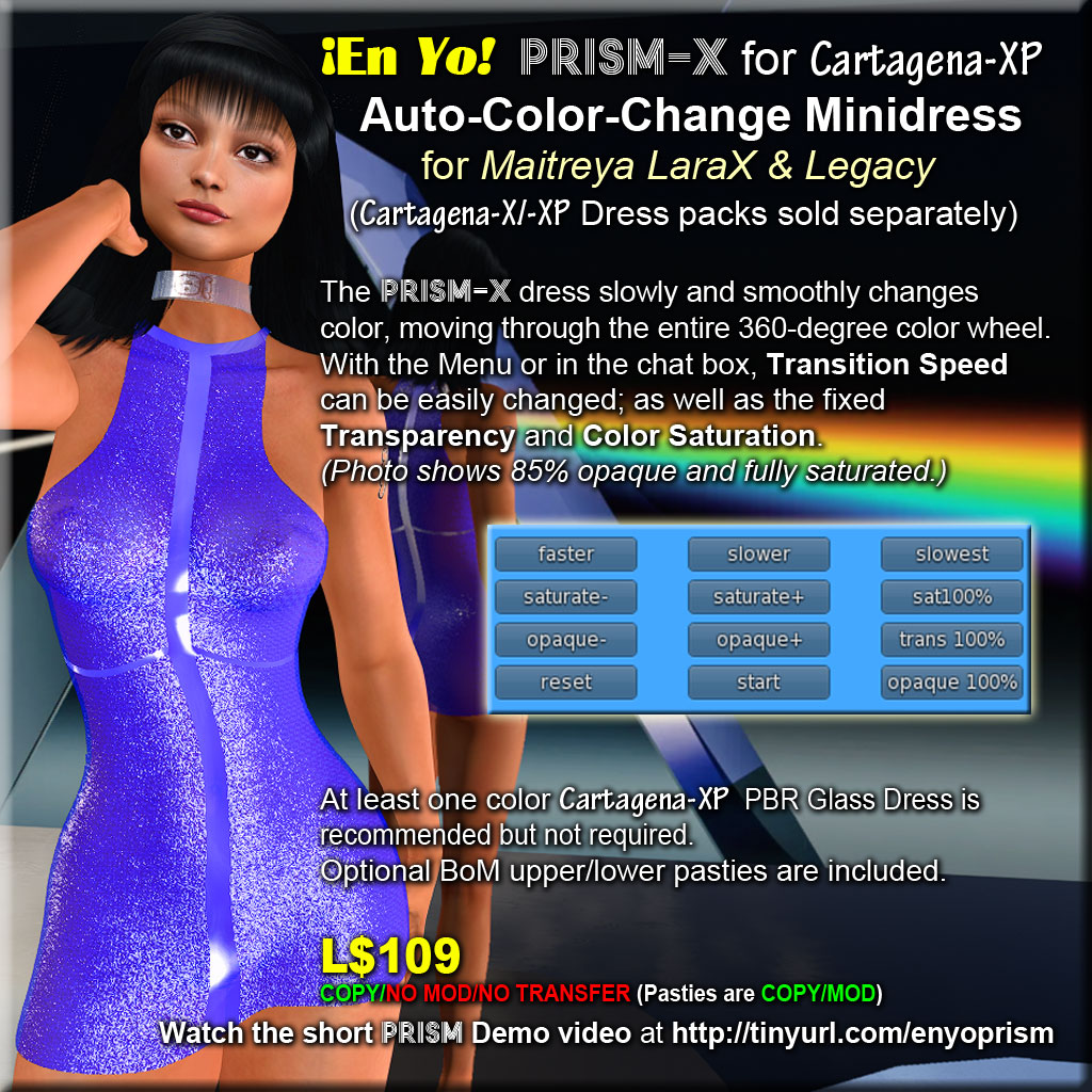 Back to the minidresses! Cartagena-XP is transparent except for the trim; the PRISM-X plays off of that contrast for some interesting effects. L$109 for LaraX and Legacy! Wear alone or with any color Cartagena-X dress for lots of unique looks!