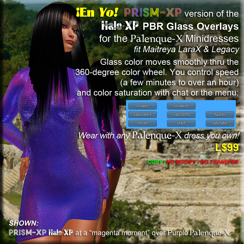 Two unique ¡En Yo! projects come together again in this new PRISM-XP version of my HALO-XP PBR Glass Overlays! Wear any color Palenque-X and the PBR glass Halo-XP will slowly change color, creating a whole range of amazing effects. Like Palenque-X/XP it works on LaraX and Legacy.